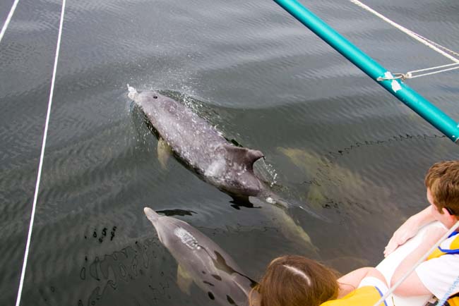 Een van de "betere" plaatjes van een van de vele dolfijnen in Port Stephens - de baai waar Nelson Bay aan ligt. Deze is genomen op een bewolkte dag (anders was de zee wel blauwer)