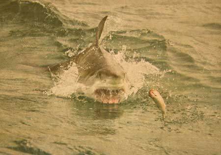 Uit de Examiner van 19/3/09 -foto van George Trinkler - A white pointer shark chasing bait off Stockton Beach