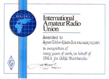 In the "early nineties" IARU Region I became interested and asked me to organise the pooling of knowledge about training schemes and adapted equipment for handicapped hams in a Region I committee: IPHA (Information Programme for Handicapped Amateurs). I was involved with that program until we moved to Australia in 1999. Once a year we published a report with contact details for the various handicapped hams organisations within Region I and with a summary of new developments and tips.